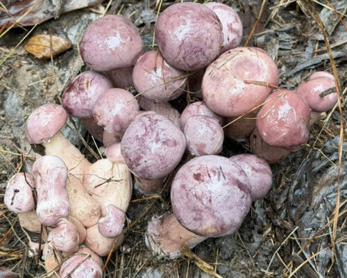 Fallen Melaleuca leaves cover the forest floor, forming a thick layer of organic mulch. After the first seasonal rains, heat and humidity build up beneath this layer, creating ideal conditions for fungal spores to develop. Within days, small, round, purple mushrooms begin to emerge quietly from beneath the leaves.